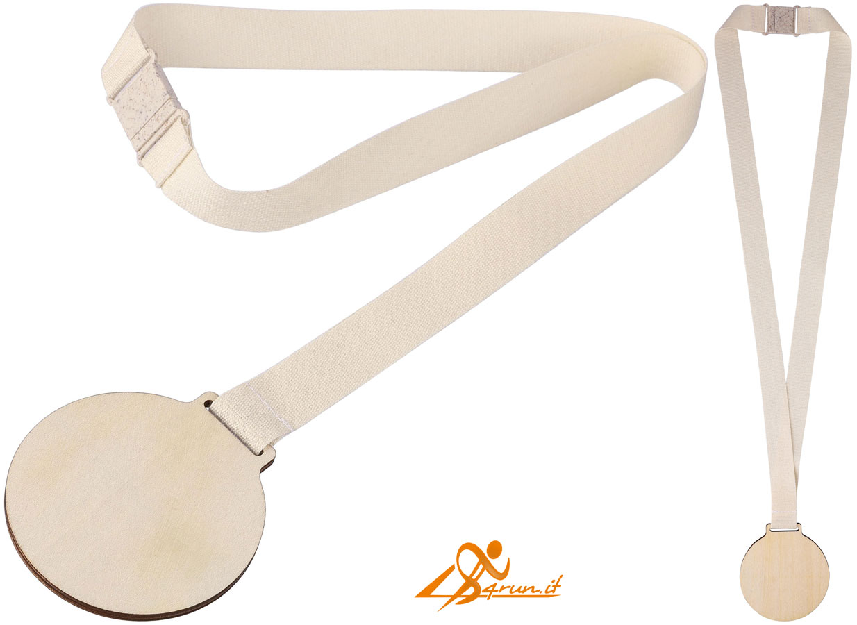 | Materiale | Medaglia in legno di tiglio e nastro in cotone. Sgancio di sicurezza in plastica paglia di grano |